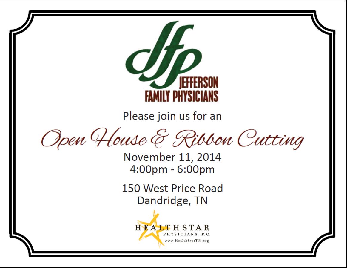 WHEN: Tuesday, November 11, 2014 TIME: 4:00pm - 6:00pm WHERE: Jefferson Family Physicians (Healthstar Physicians) 150 West Price Road Dandridge, TN 37725